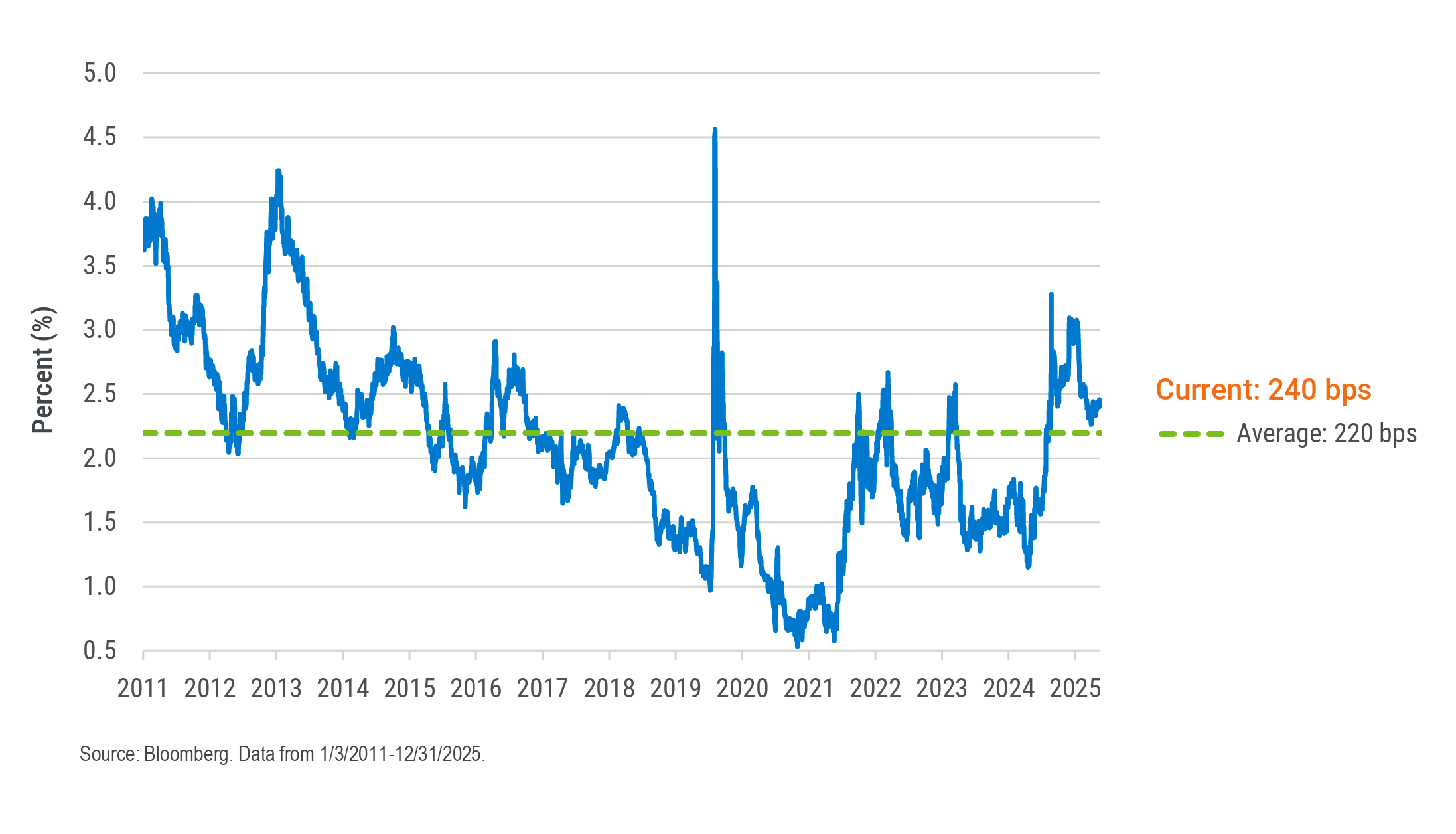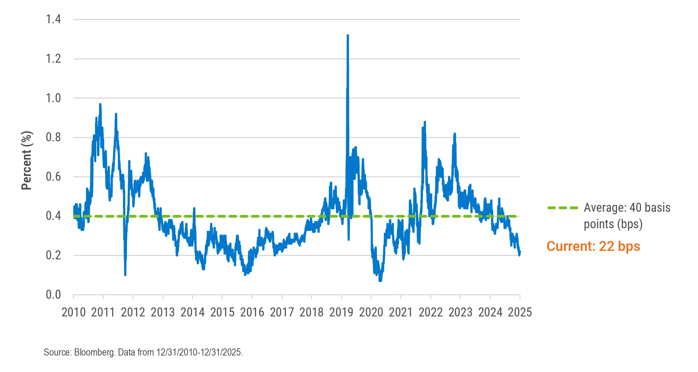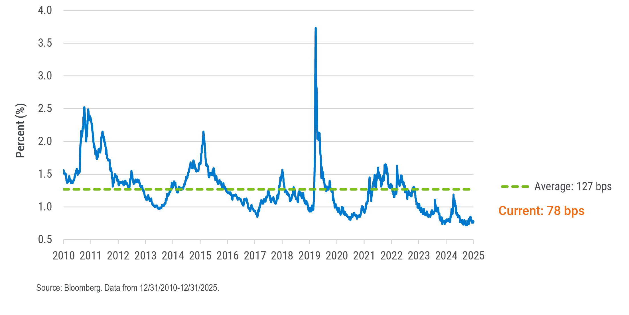 As we mentioned in December’s Shape of the Markets, 2025 was a solid year for fixed income, posting rather attractive returns for the year. Leading much of the charge, particularly for our peers and the Bloomberg US Aggregate Bond Index (“the Agg”), were Agency Mortgage-Backed Securities (Agency MBS) and Investment Grade (IG) Corporates, which experienced notable spread tightening throughout the year. These are two sectors we are generally underweight when compared to both our peers and the Agg.