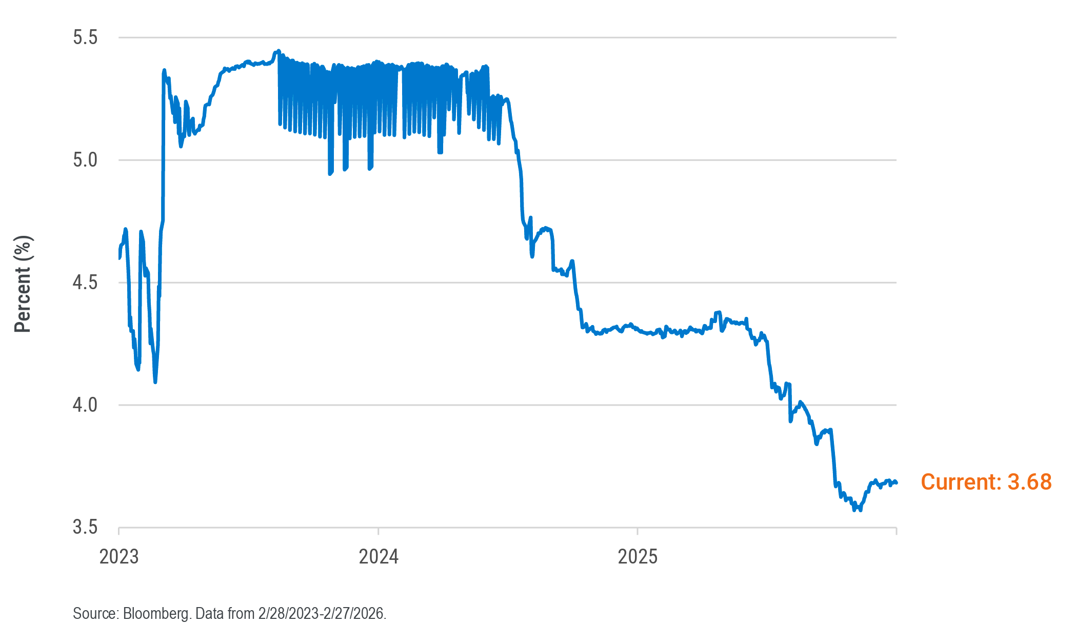 Money Market Fund assets are at record highs, reaching $8.27 Trillion last week.1 This occurs as the yield on money markets continues to fall. Today, money market yields are nearly 2% lower than their 2023 peak.