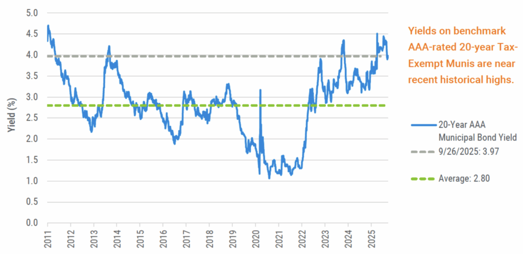 Source: Bloomberg, AAA MMD Municipal Bond Yield. Data from 1/3/2011 – 9/26/2025. Past Performance does not guarantee future results.