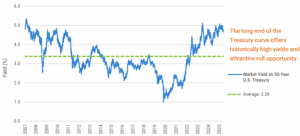The 20-year Treasury was reintroduced in 2020. Since its reintroduction, it has historically yielded as much, if not more than the 30-year Treasury because it is somewhat regarded as the “ugly stepchild” to the more favored 10-year and 30-year bonds. While we currently favor the return potential found at the 20-year spot on the curve to the 30-year, we can use the 30-year Treasury’s longer history to illustrate relative attractiveness representing the long-end of the Treasury curve.