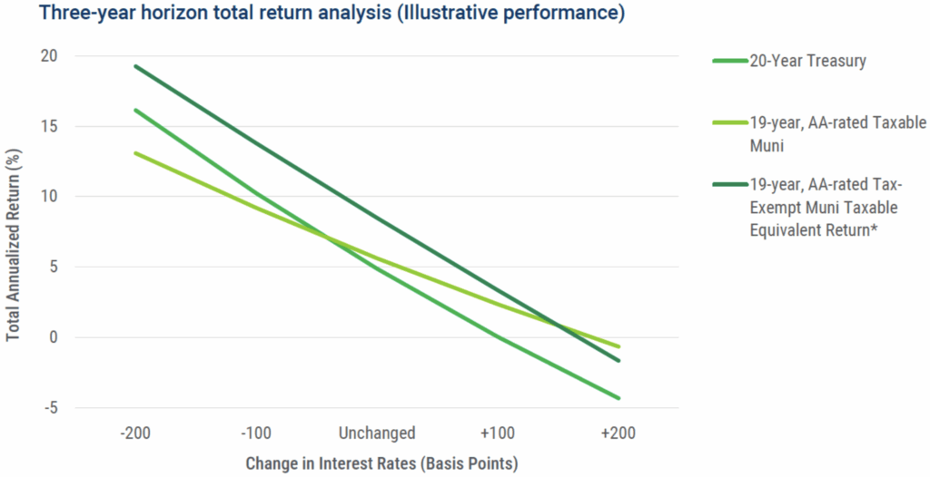 Sources: PTAM, Bloomberg as of 9/26/2025. The following bonds that are used to create the Shapes are held by PTAM clients as of the date of this distribution: 20-year Treasury; 19-year AA-rated Taxable Muni; 19-year, AA-rated Tax-Exempt Muni Taxable Equivalent Return. In calculations for the Taxable Equivalent Return, we found the difference between the starting yield and the taxable equivalent yield, then added that difference to the bond’s scenario-based total return analysis to account for taxable equivalent income. The 19-year, AA-rated Taxable Muni Shape was generated with 1 bond currently held by PTAM and fitting the criteria stated. The 20-year Treasury is constructed with the on-the-run-20-year Treasury, but broadly speaking, could be a Treasury with a tenor between 15-and 25-years.